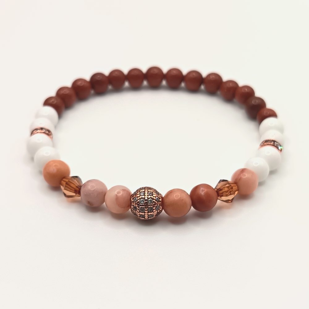 Kezdőlap Ásványkarkötők Aranybarna homokkő – fehér achát – jáde karkötő rózsaarany részletekkel