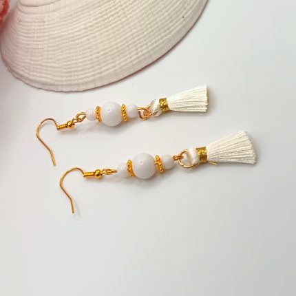 Arany akasztós fülbevaló – fehér achát gyönggyel és krémfehér bojttal