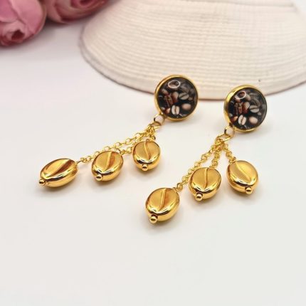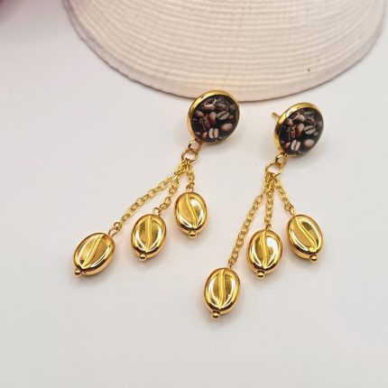 Arany bedugós fülbevaló – kávészemes lencsével, arany kávészemgyöngyökkel
