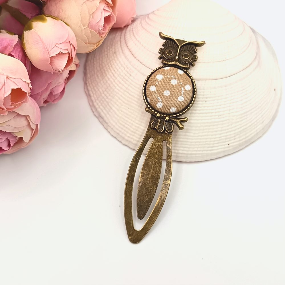 Kezdőlap Kulcstartók, könyvjelzők Antik bronz könyvjelző – baglyos, barna pöttyös textil lencsével