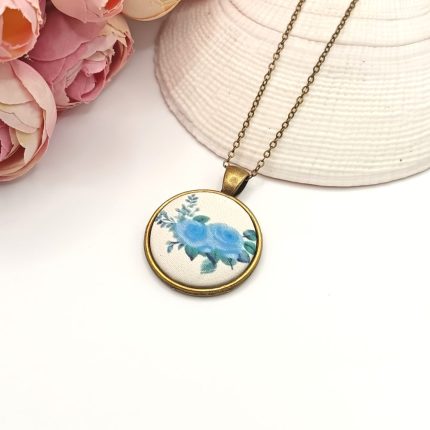 Antik bronz nyaklánc – kék rózsa mintás textillel