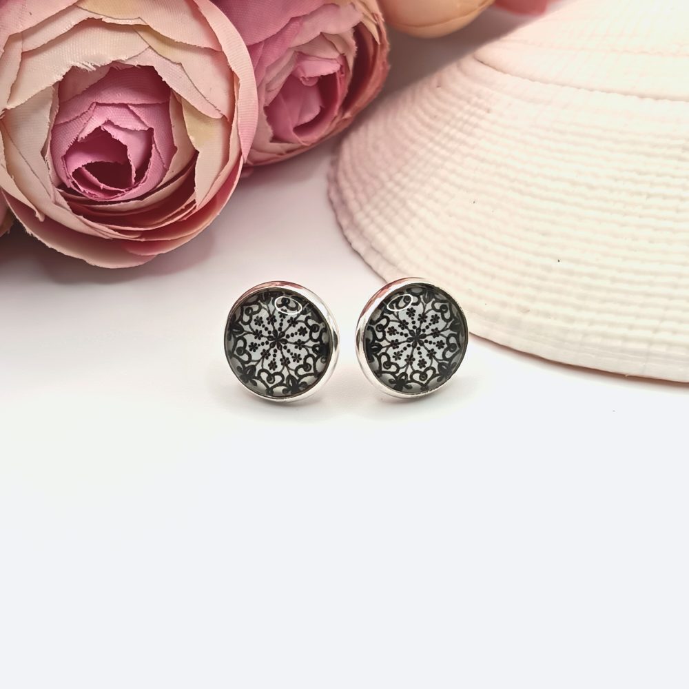 Kezdőlap Fülbevalók Bedugós fülbevaló Ezüst bedugós fülbevaló – fehér, fekete csipkemintás lencsével