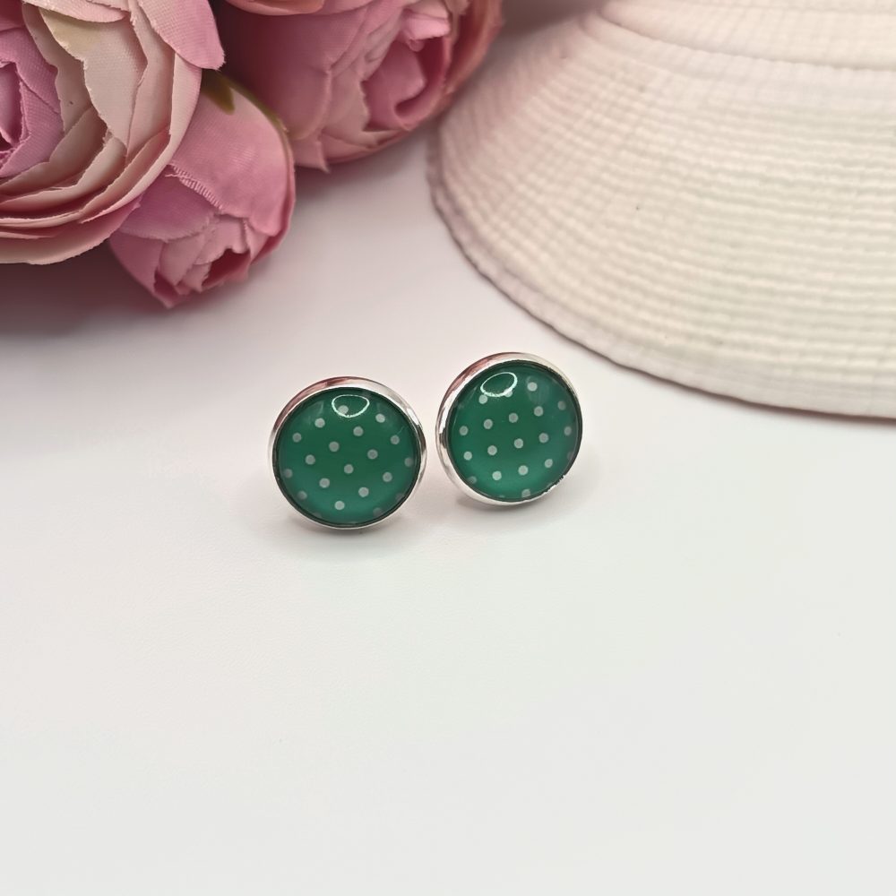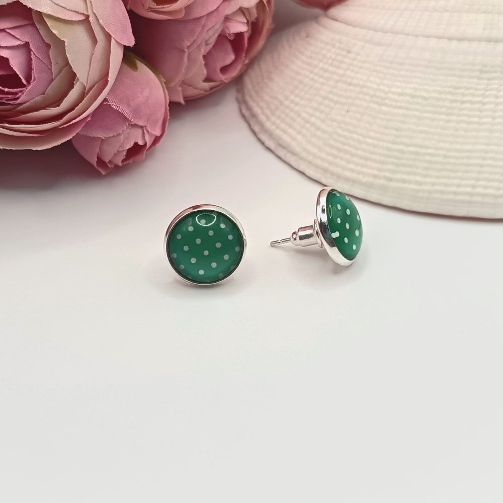 Ezüst bedugós fülbevaló – zöld, fehér pöttyös lencsével