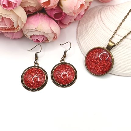 Antik bronz ékszerszett – nyaklánc és fülbevaló piros csillogó textilbőrrel