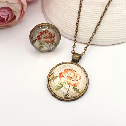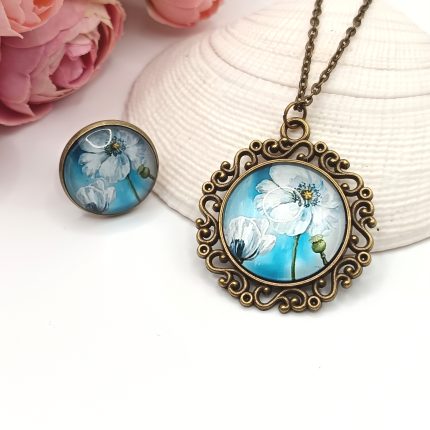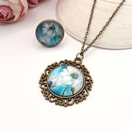 Antik bronz ékszerszett – nyaklánc és gyűrű fehér virágmintával