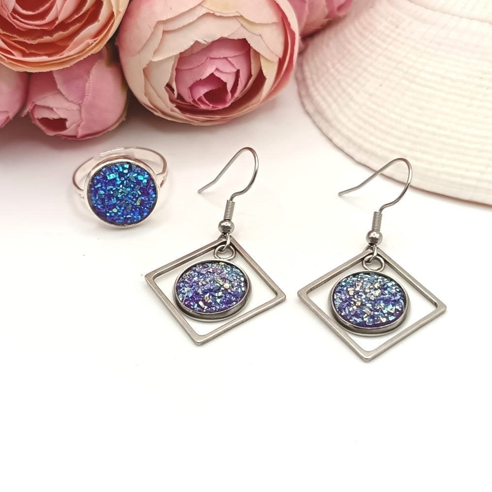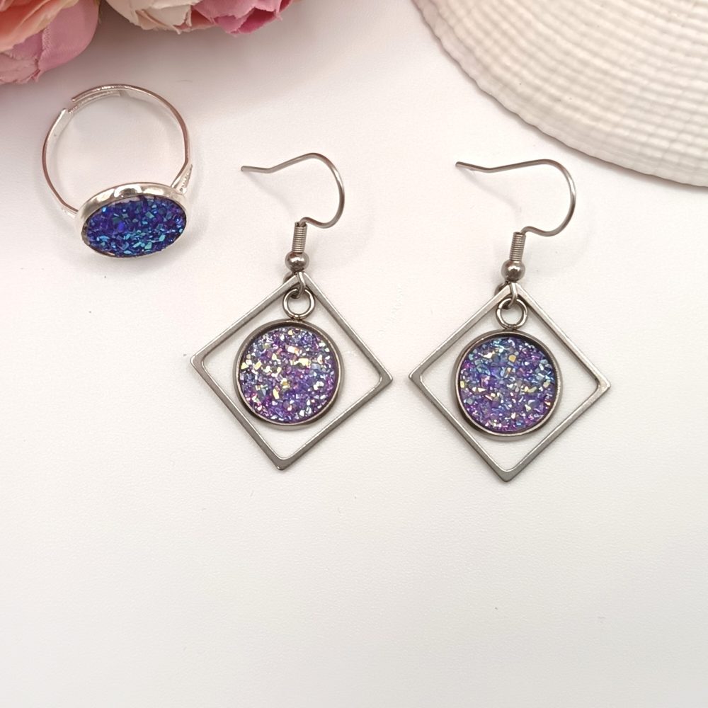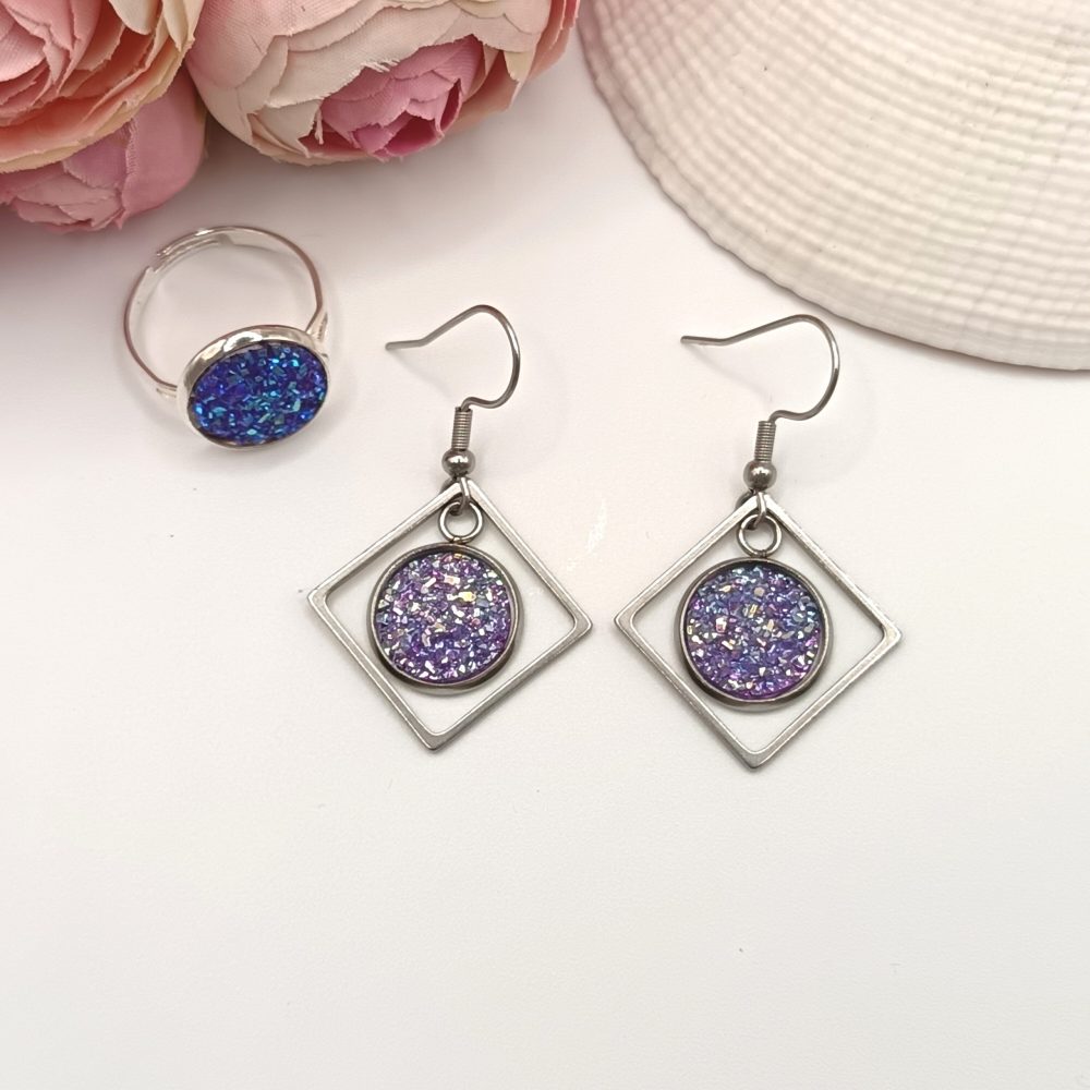 Ezüst ékszerszett – gyűrű és fülbevaló csillogó világos lila lencsével