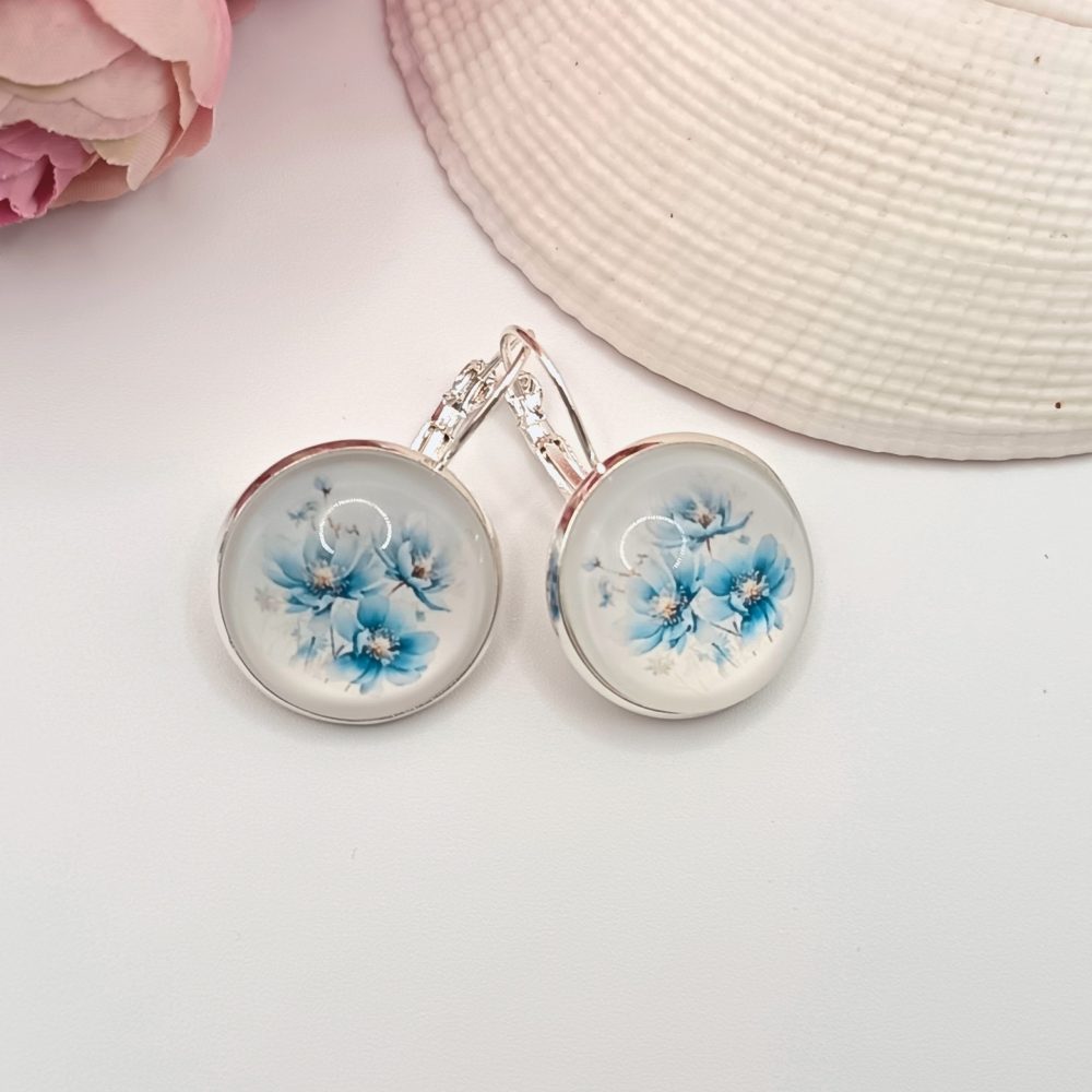 Ezüst franciakapcsos fülbevaló – kék virágmintás lencsével