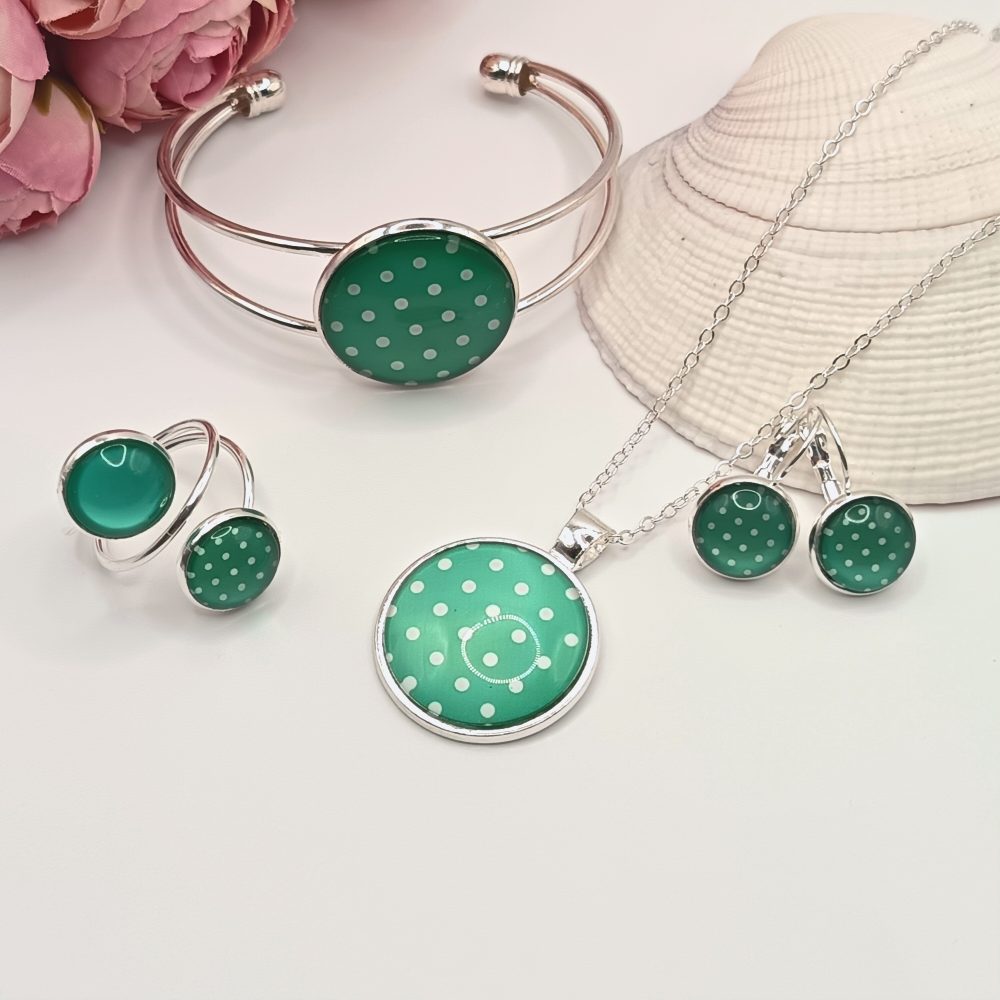 Ezüst nyaklánc – zöld, fehér pöttyös lencsével
