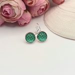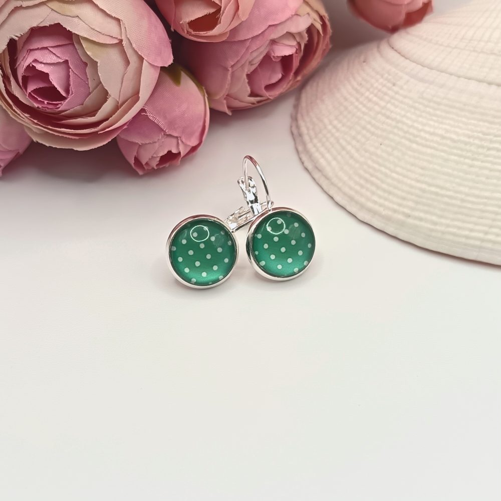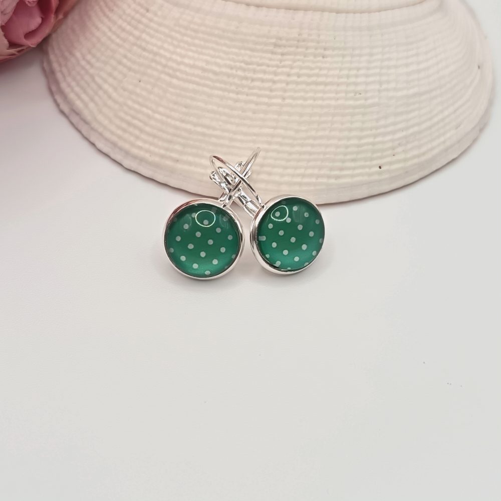 Ezüst franciakapcsos fülbevaló – zöld, fehér pöttyös lencsével