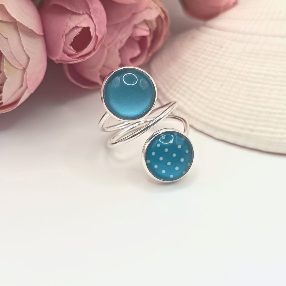 Ezüst gyűrű – kék / fehér pöttyös dupla lencsével