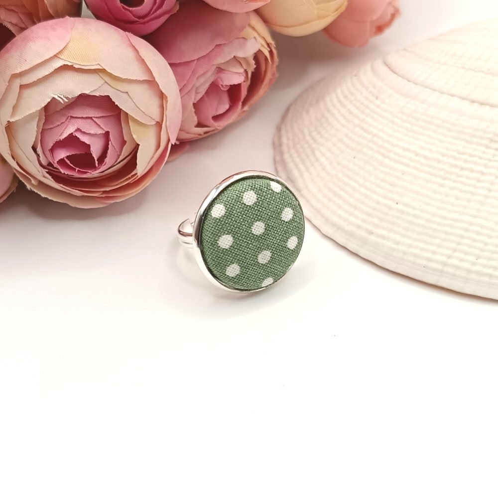 Ezüst gyűrű – zöld, fehér pöttyös textillel