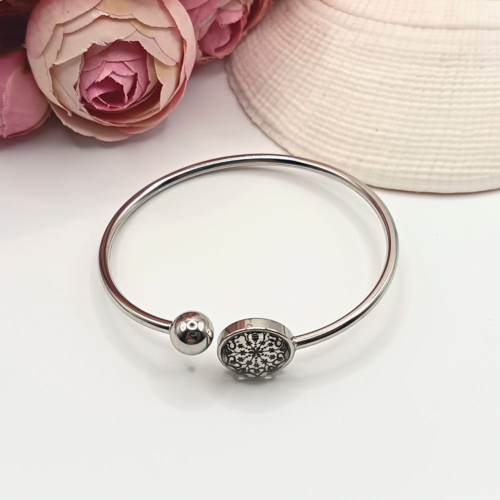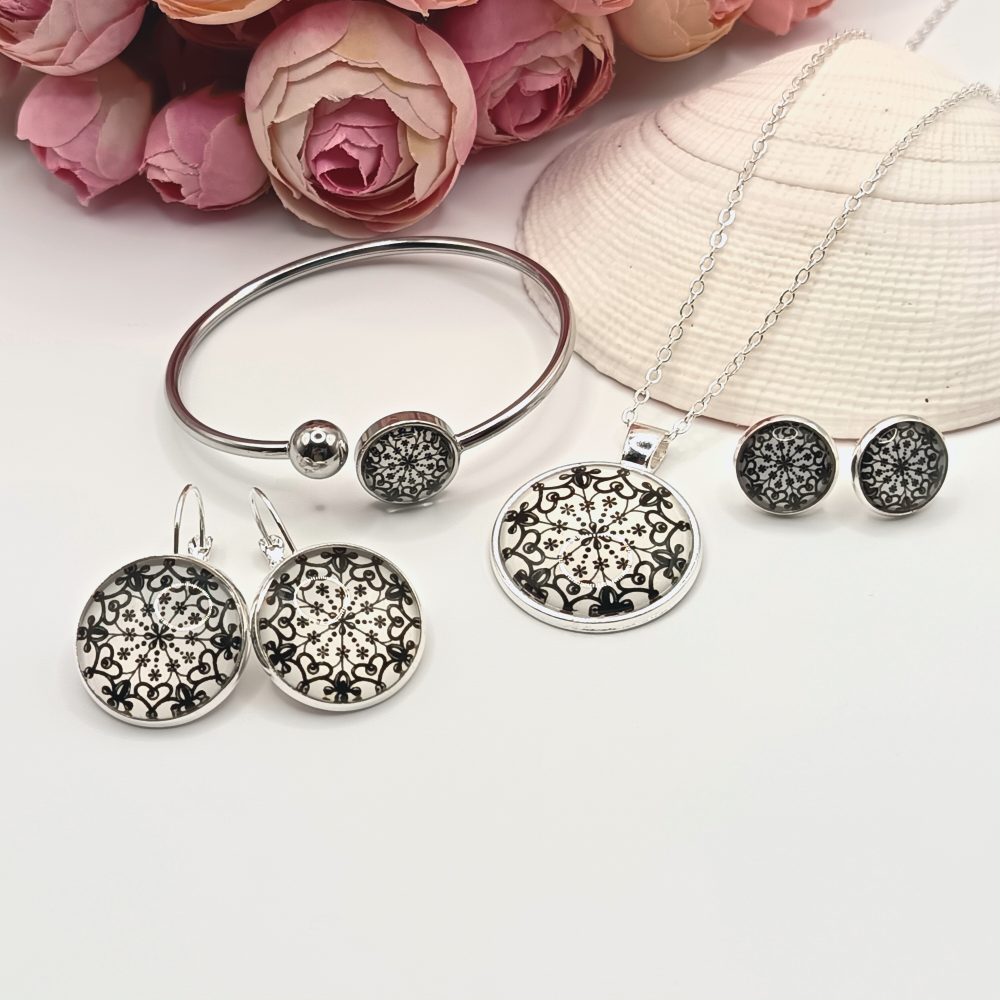Ezüst karkötő – fehér, fekete csipkemintás lencsével