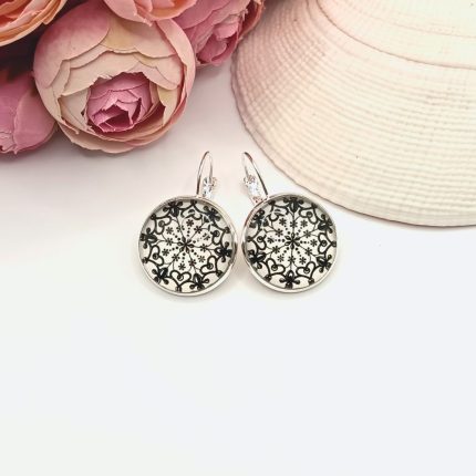 Ezüst franciakapcsos fülbevaló – fehér, fekete csipkemintás lencsével
