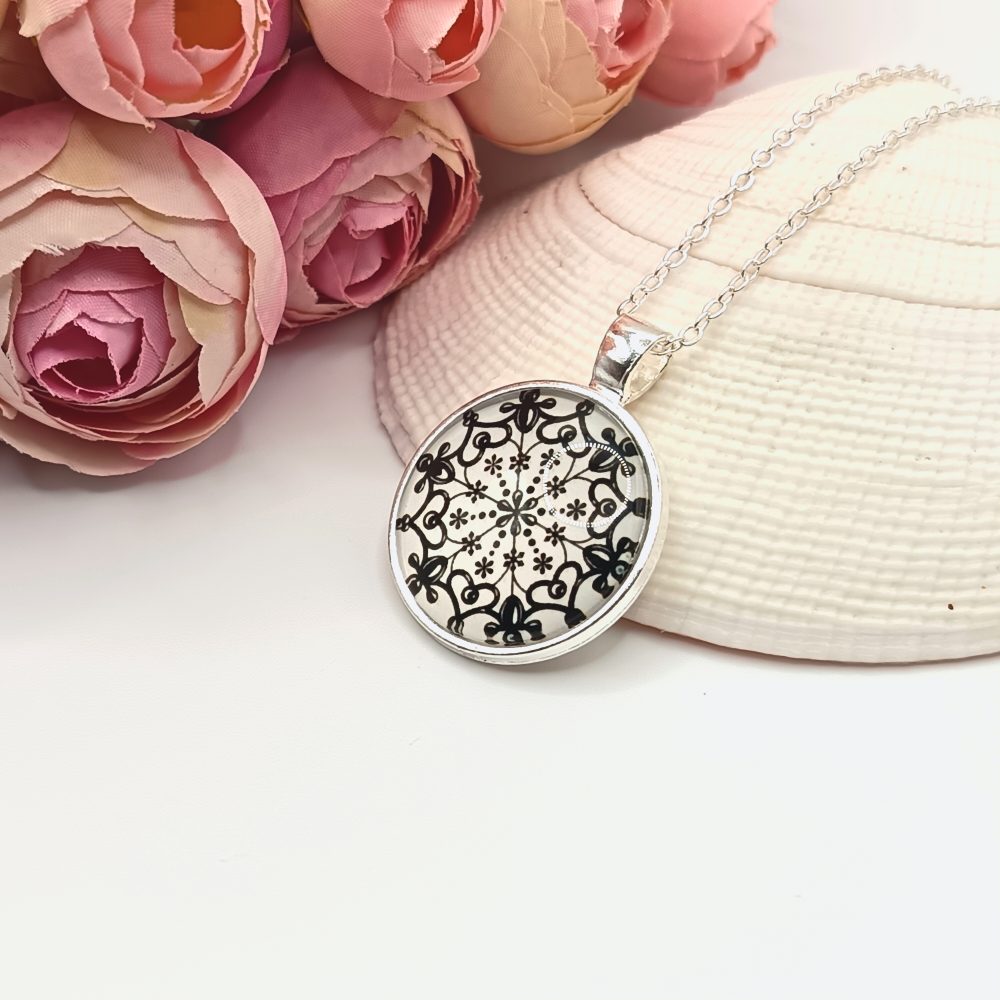 Kezdőlap Nyakláncok Ezüst nyaklánc – fehér, fekete csipkemintás lencsével