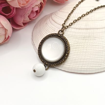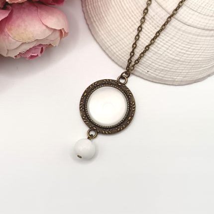Antik bronz nyaklánc – fehér üveg lencsével és fehér gyönggyel