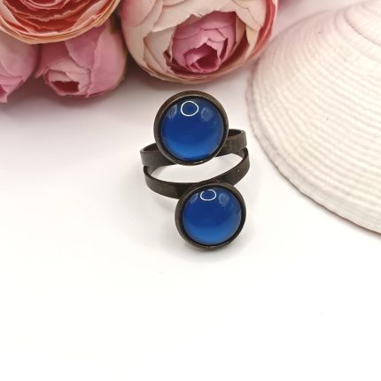 Antik bronz gyűrű – kék dupla üveg lencsével