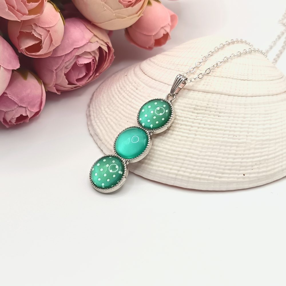 Ezüst nyaklánc – zöld, fehér pöttyös lencsével