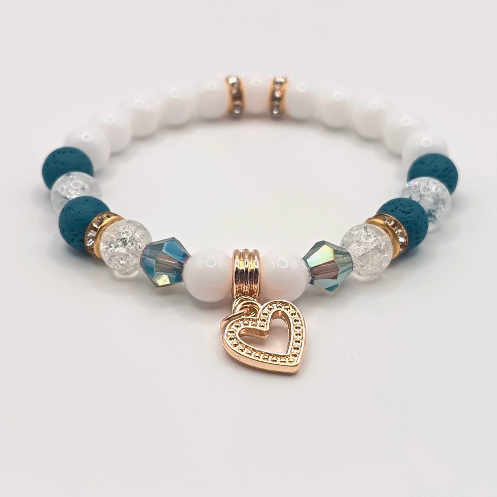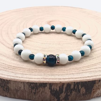 Fehér achát – kék lávakő karkötő arany részletekkel
