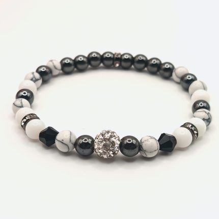 Fehér achát – howlit – hematit karkötő ezüst részletekkel