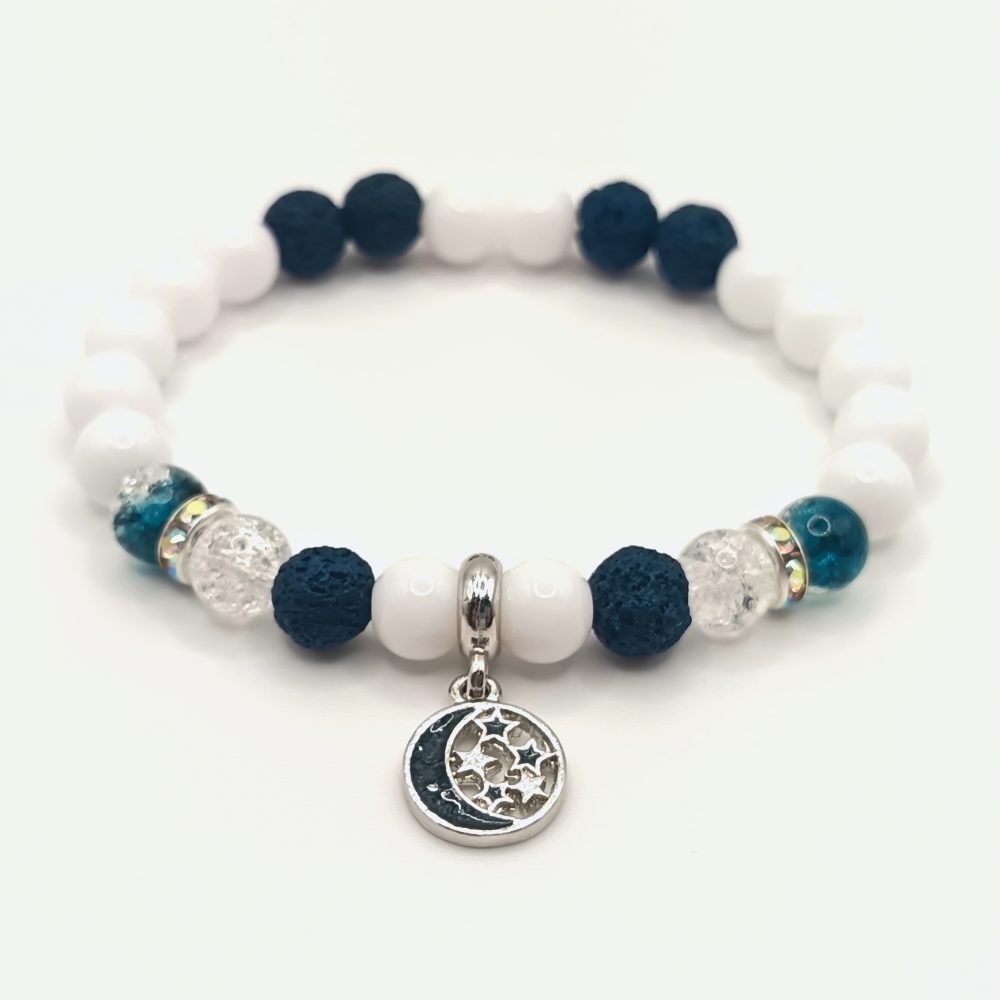 Fehér achát – sötétkék lávakő karkötő ezüst részletekkel