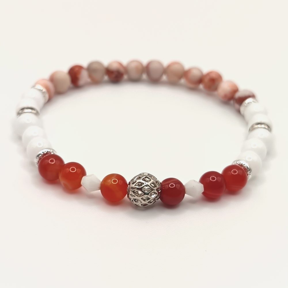 Kezdőlap Ásványkarkötők Fehér achát – vörös karneol – jáspis karkötő ezüst részletekkel