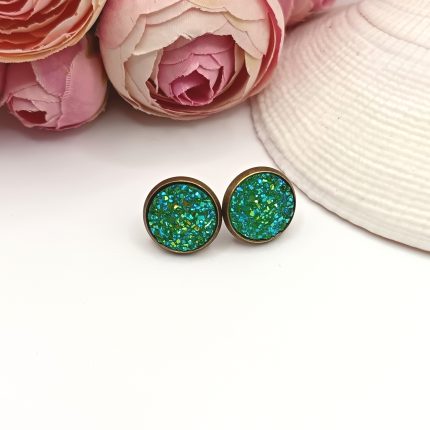 Antik bronz bedugós fülbevaló – csillogó zöld lencsével
