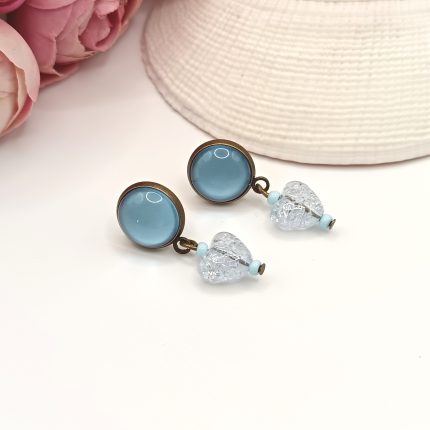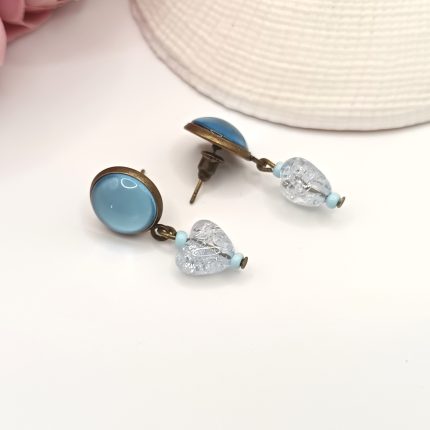 Antik bronz bedugós fülbevaló – kék üveg lencsével és kék roppantott szív gyönggyel