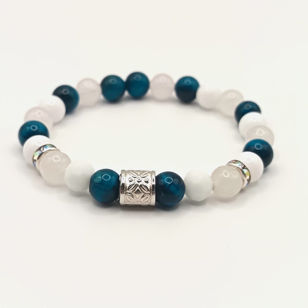 Kék tigrisszem – holdkő – fehér achát karkötő ezüst részletekkel