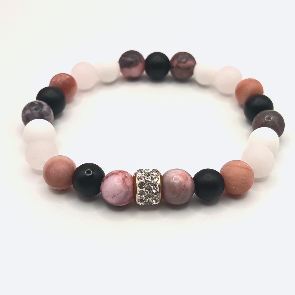 Kezdőlap Ásványkarkötők Matt fehér kalcedon – rodonit – fekete ónix karkötő arany részletekkel