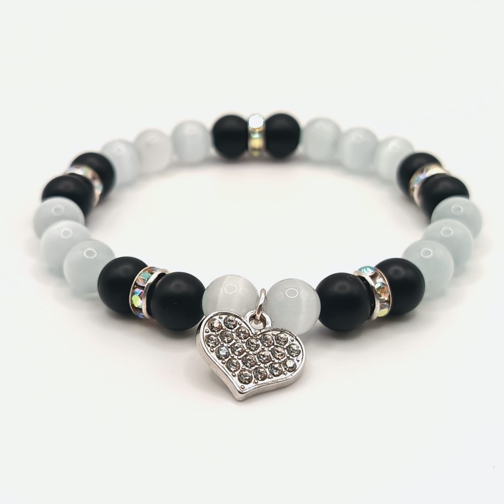 Matt fekete ónix – fehér opál macskaszem karkötő ezüst részletekkel