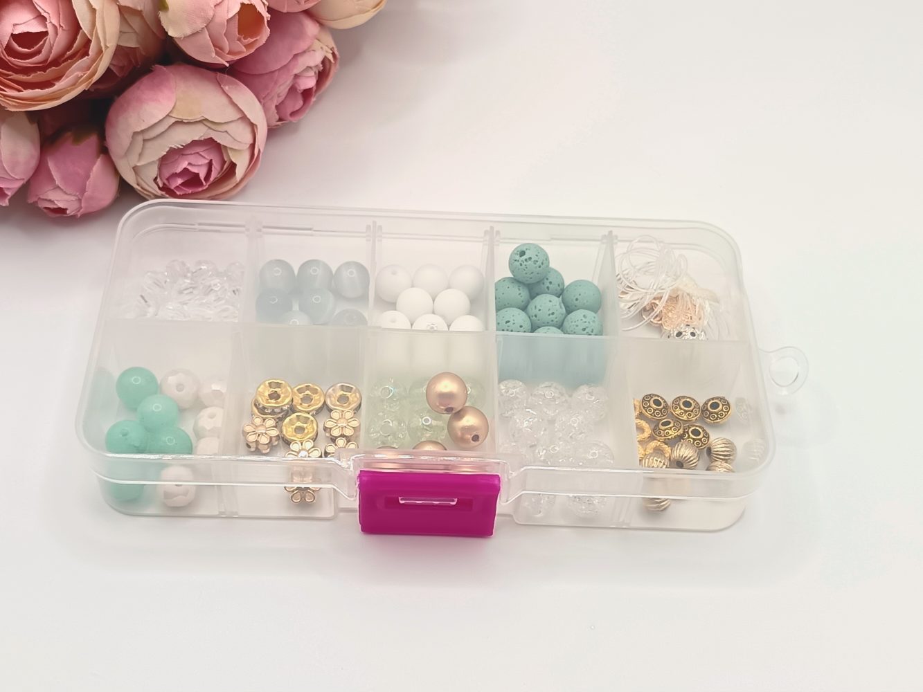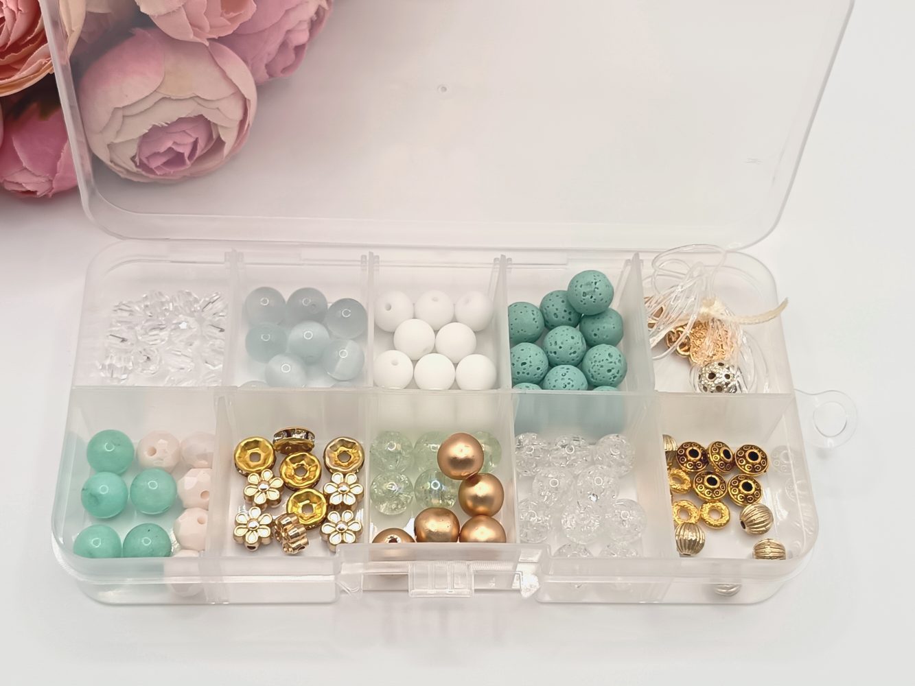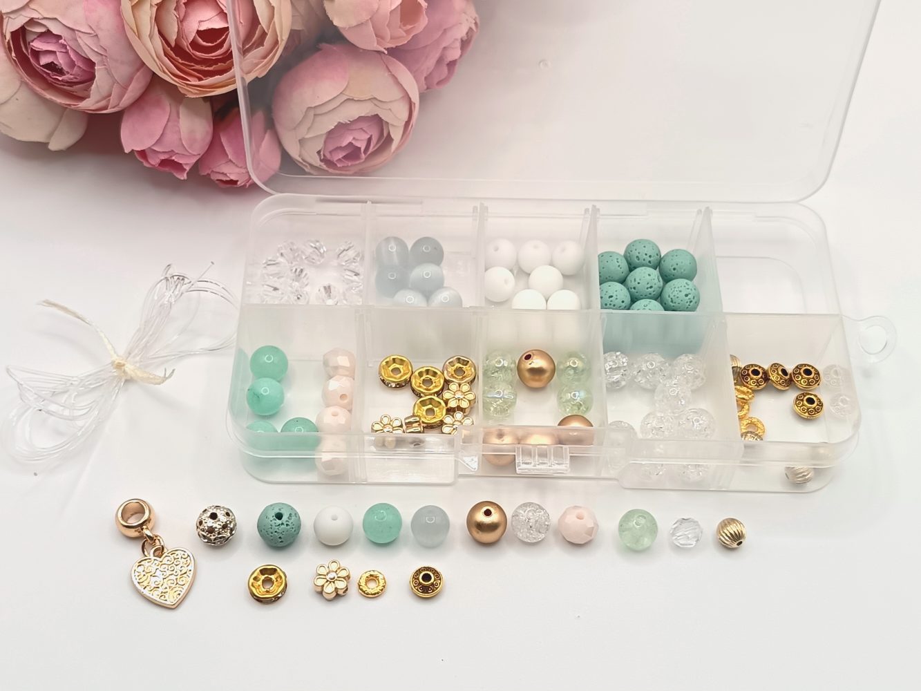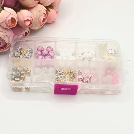 A gyöngyök és különféle elemek eltérő színekben és formákban találhatóak a dobozban, így szabadon kombinálhatod őket, és teljesen egyedi ékszereket alkothatsz.