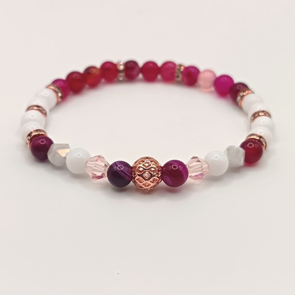Fehér kalcedon – repedt rózsaszín achát ásványgyöngy karkötő rózsaarany kiegészítőkkel