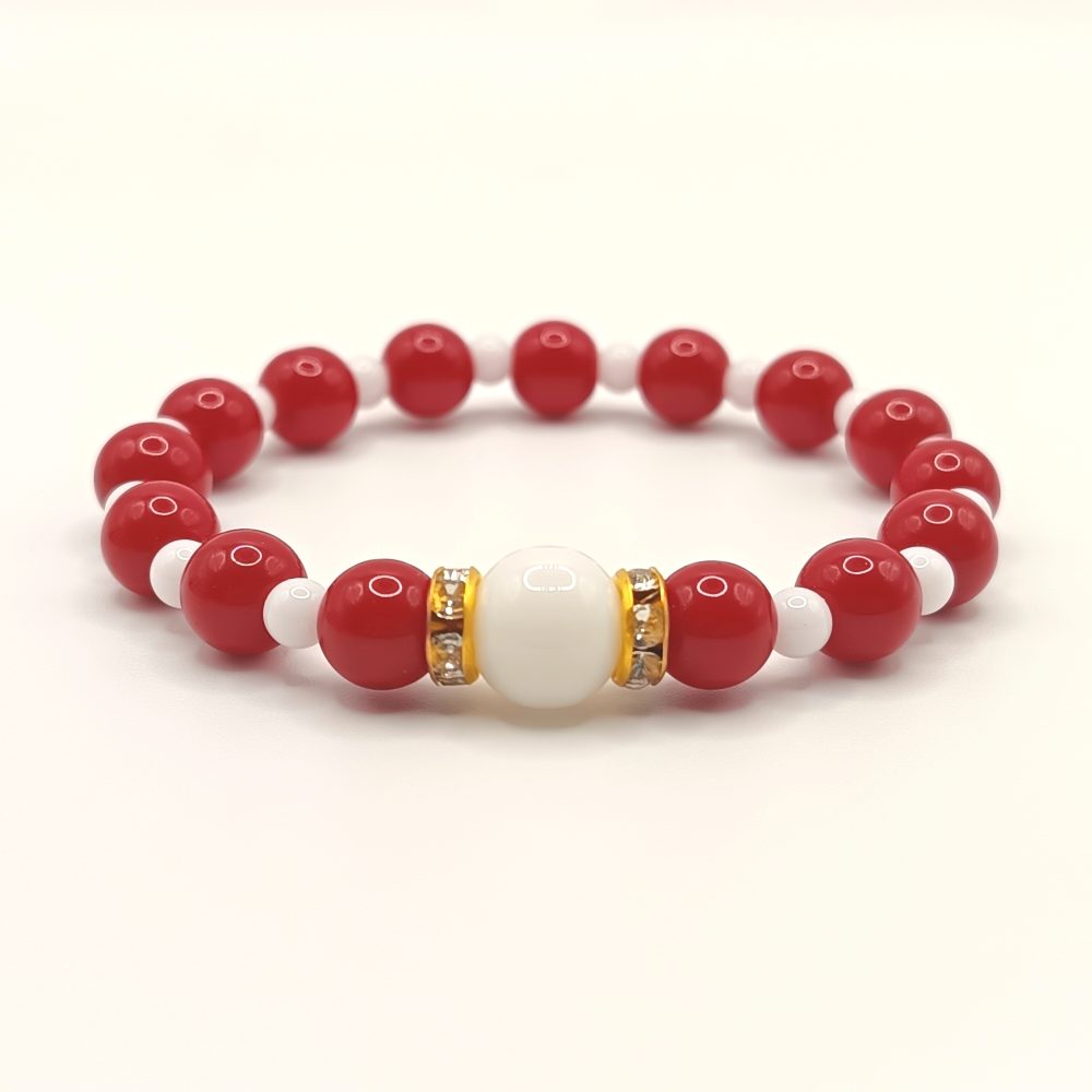 Piros korallkő – fehér achát karkötő arany részletekkel