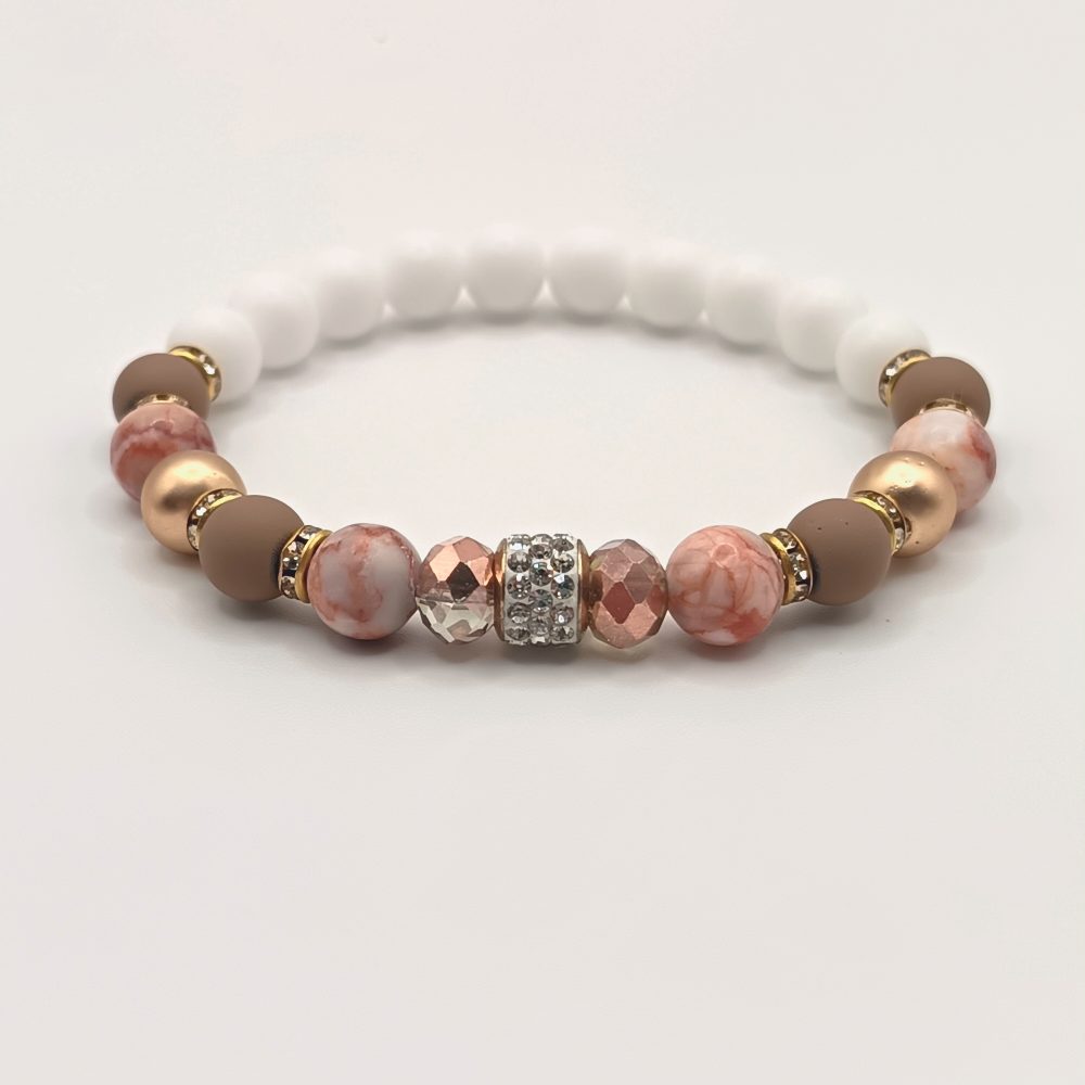 Fehér kalcedon – repedt rózsaszín achát ásványgyöngy karkötő rózsaarany kiegészítőkkel
