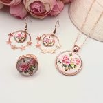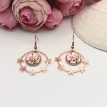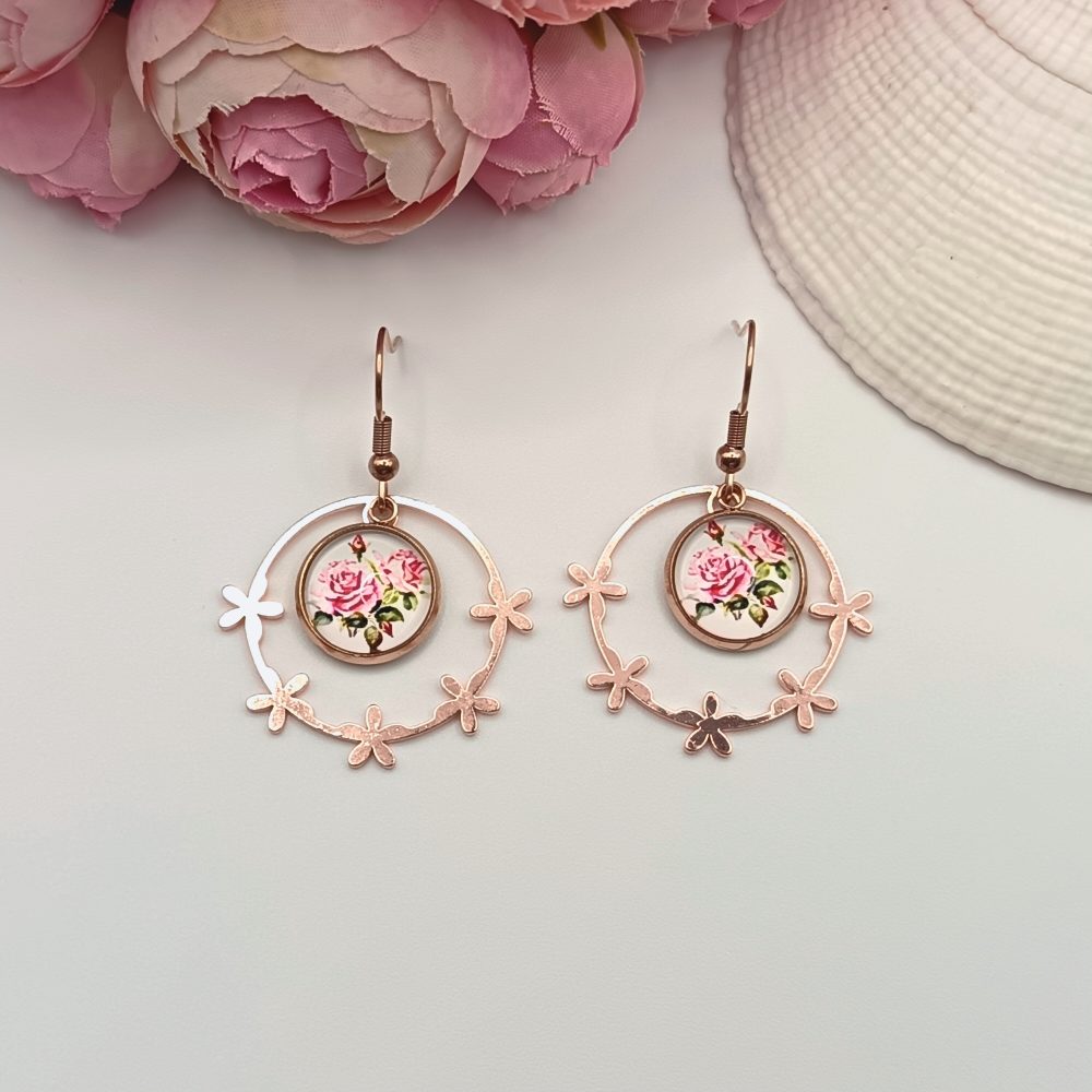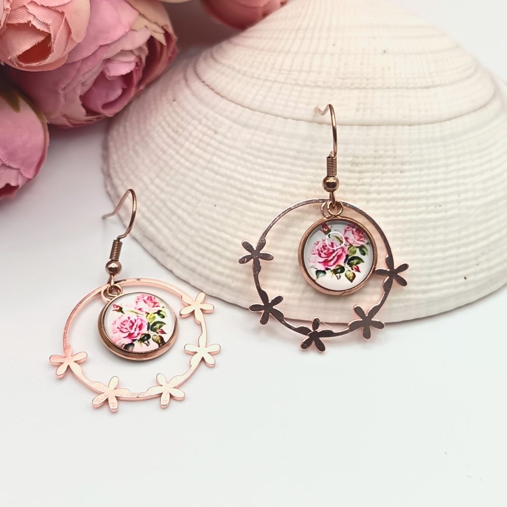 Rózsaarany akasztós fülbevaló – rózsa mintás lencsével