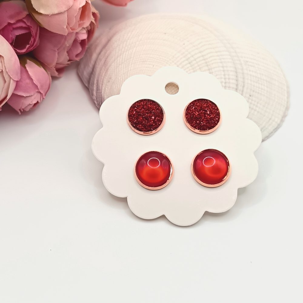 Rózsaarany bedugós fülbevaló – csillogó piros / piros macskaszem lencsékkel
