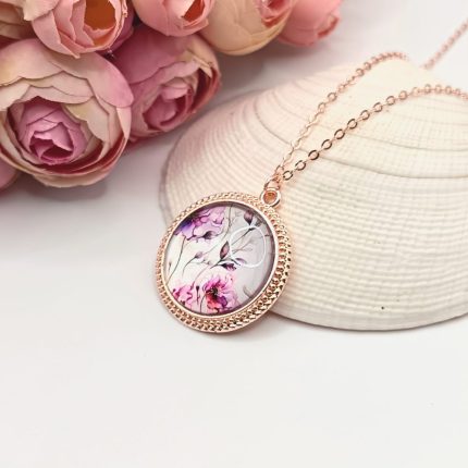 Rózsaarany nyaklánc – lila / rózsaszín virágokos lencsével