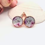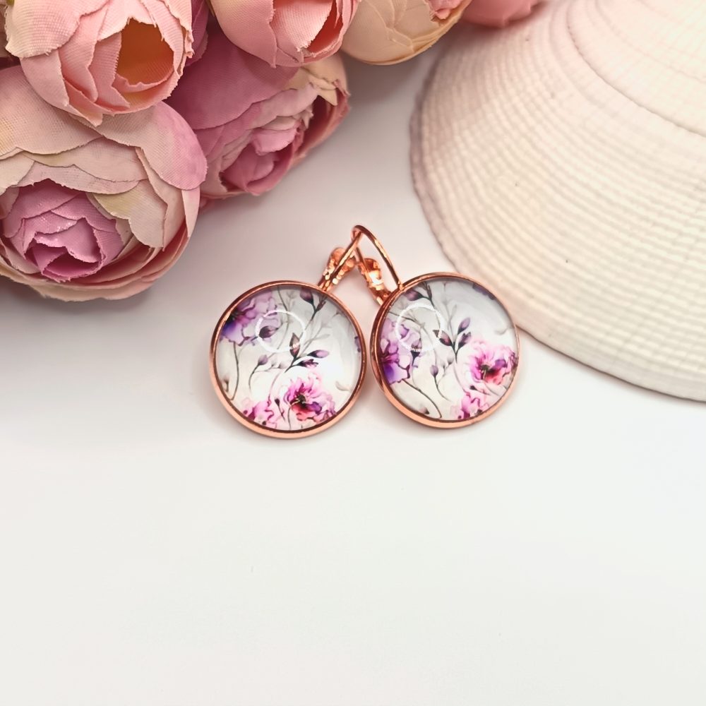 Rózsaarany franciakapcsos fülbevaló – lila / rózsaszín virágokos lencsével