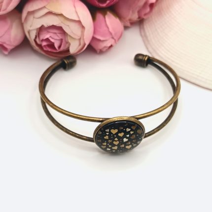 Antik bronz karkötő – fekete, arany szívecskés lencsével