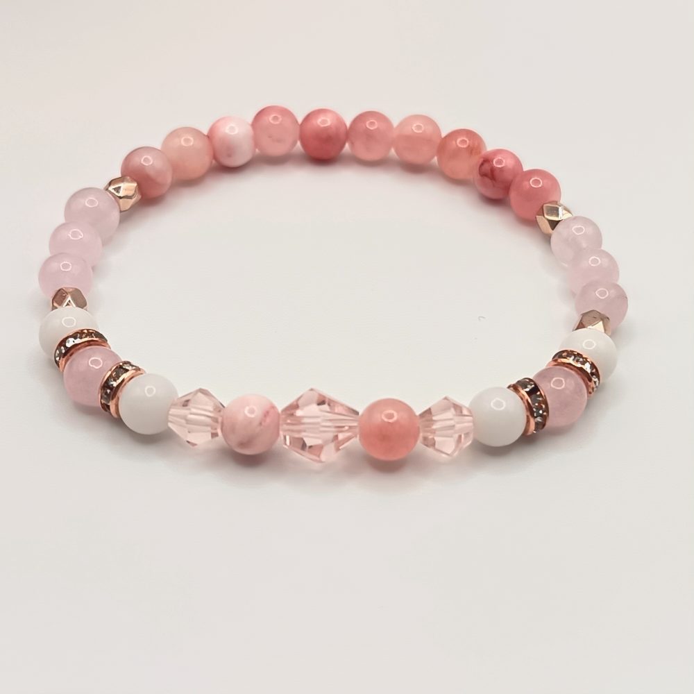 Rózsaszín jáde – fehér achát – rózsakvarc karkötő rózsaarany részletekkel