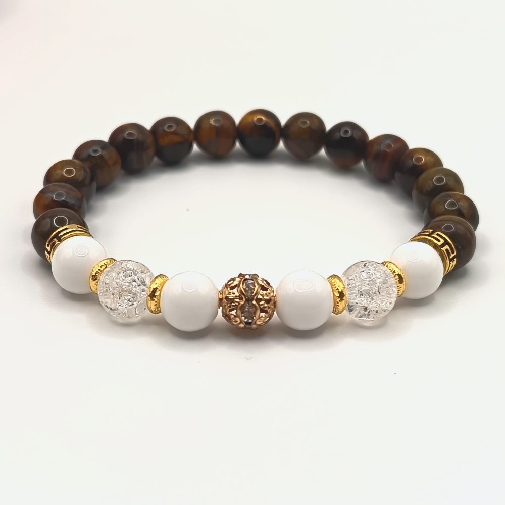 Tigrisszem – fehér achát karkötő arany részletekkel