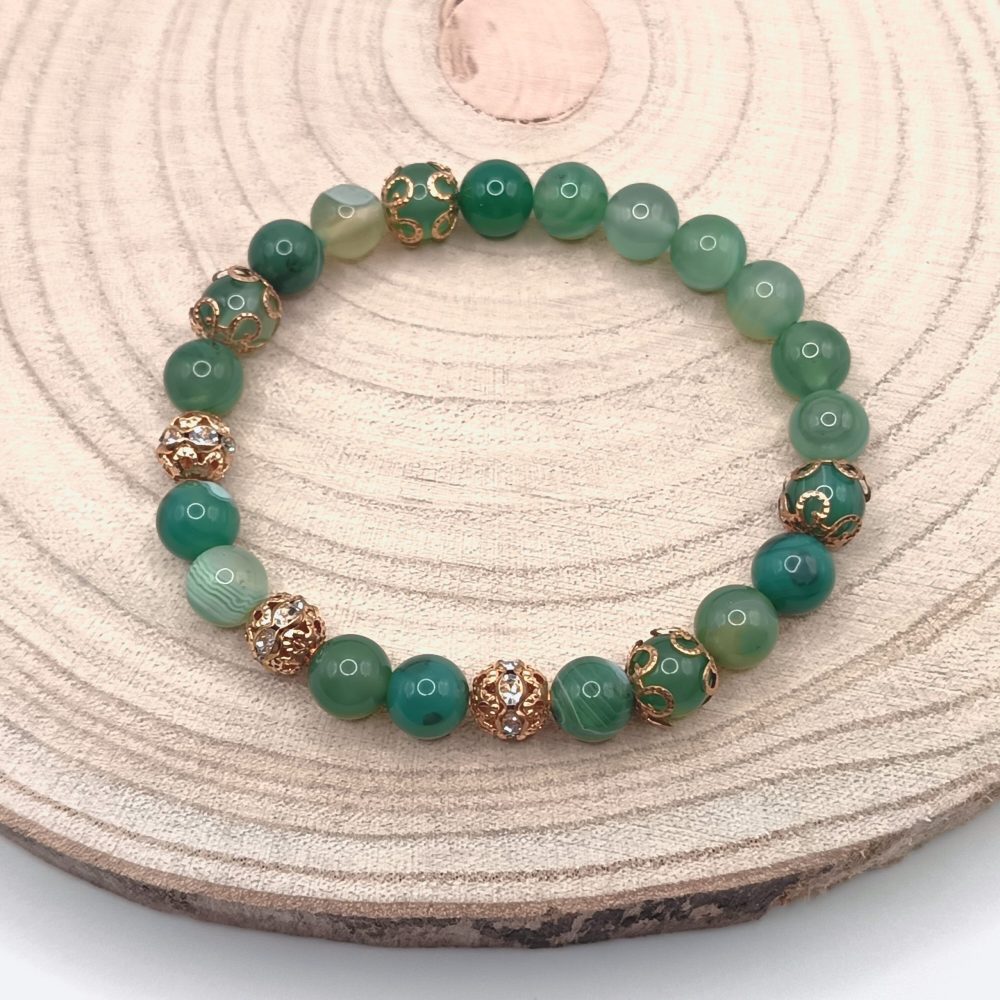 A zöld csíkos achát karkötő kiváló választás, ha friss energiákra, lelki megújulásra és természetes eleganciára vágysz. Egy kiegészítő, amely egyszerre látványos és harmonikus – a tudatos jelenlét és a nyugodt erő szimbóluma.