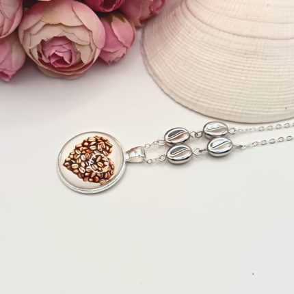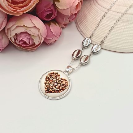 Ezüst nyaklánc – kávészív lencsével, ezüst kávészemgyöngyökkel