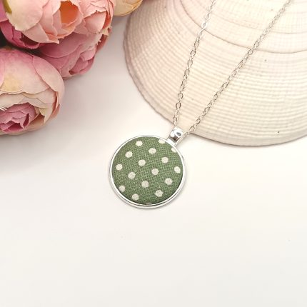 Ezüst nyaklánc – zöld, fehér pöttyös textillel